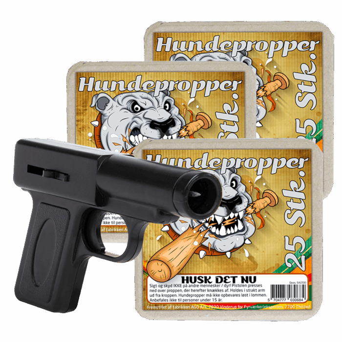 Hundepropsortiment med 3 pk. propper og 1 pistol.