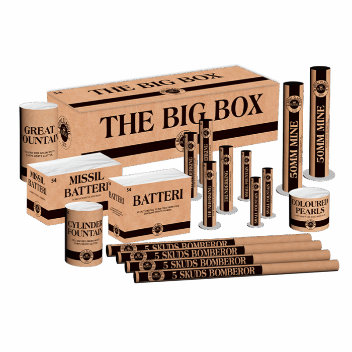 The Big Box er skabt perfekt til unge fyrværkerientusiaster. Med hele 513 gram krudt er dette fyrværkerisæt en imponerende samling af effekter, der vil lyse himlen op og skabe feststemning.