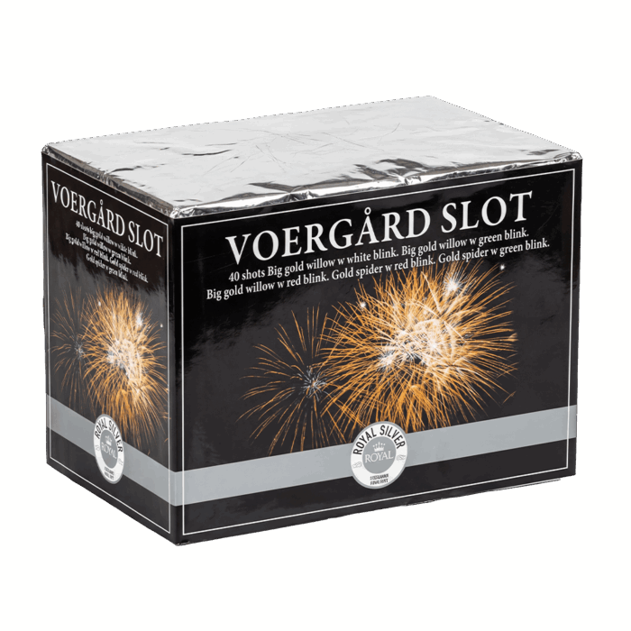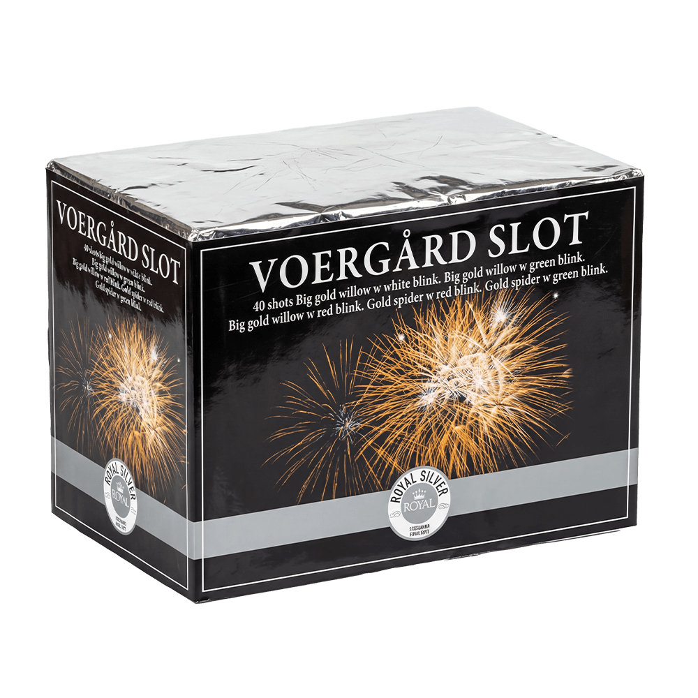 Voergård Slot batteri med 40 kraftige skud i 25 mm. Starter med en intens skydning af mørk gylden guld, der hænger længe på himlen og skaber en magisk atmosfære. Finalen afsluttes med to salver og silver spider, der spreder et fantastisk lys over himlen.