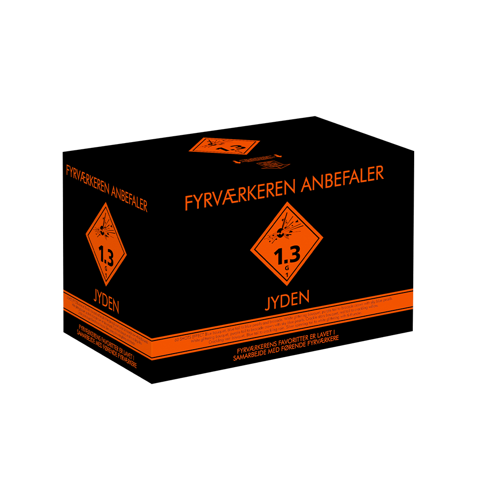 60 skuds batteri - Bærende effekter: Blue bouquet, blue tail to blue parls and brocade. White glittering bouquet, purple tail to brocade crown with sky blue pearls. White glittering bouquet - NEM 883 gram