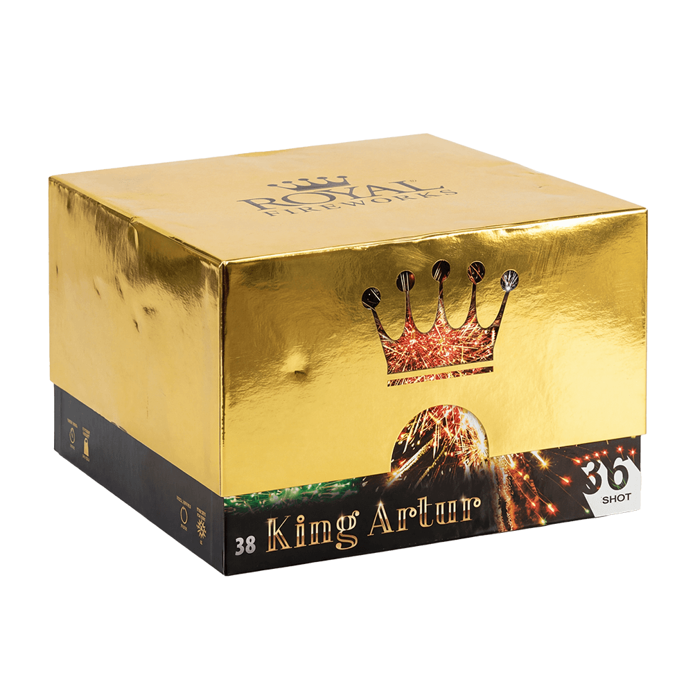 Majestætisk Fyrværkeri til Nytårsfesten. 36 imponerende skud og 415g NEM med kraftfulde røde og blå strobe-effekter samt guldglimt, der skaber en enestående visuel oplevelse både lige op og i vifteeffekt