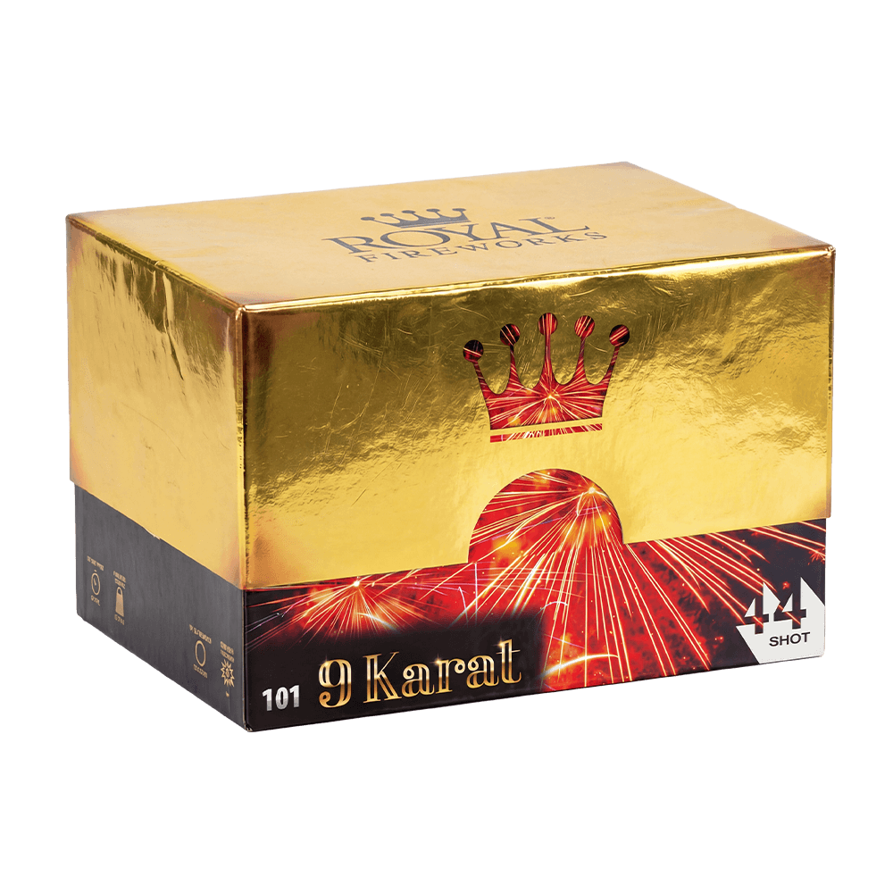 Gør din nytårsfest uforglemmelig med 9 Karat, vores eksklusive batteri designet til den kræsne fyrværker, der kun ønsker det bedste. Med imponerende 44 skud, som skyder lige op og i vifte, garanterer dette batteri action og power fra start til slut. Lad dig fortrylle af kraftige mørk guld palmer med blå stjerner, der skaber en imponerende kontrast på nattehimlen.
