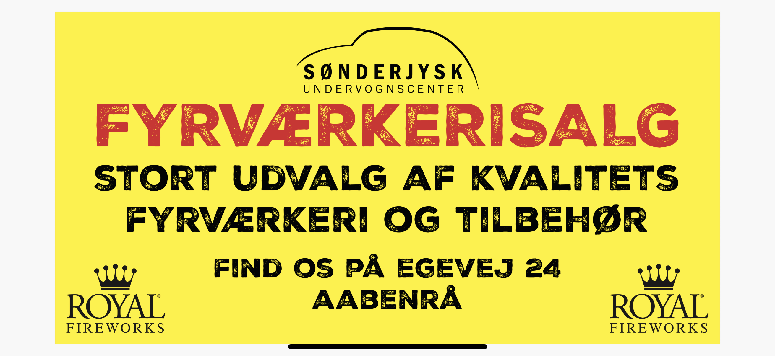 Hos Sønderjysk Undervognscenter i Aabenraa sælger vi kvalitetsfyrværkeri fra Royal Fireworks direkte fra vores store og indbydende lokale – kun få hundrede meter fra motorvejsafkørsel 70B Aabenraa. Her får du både nem adgang og rigtig gode parkeringsmuligheder.